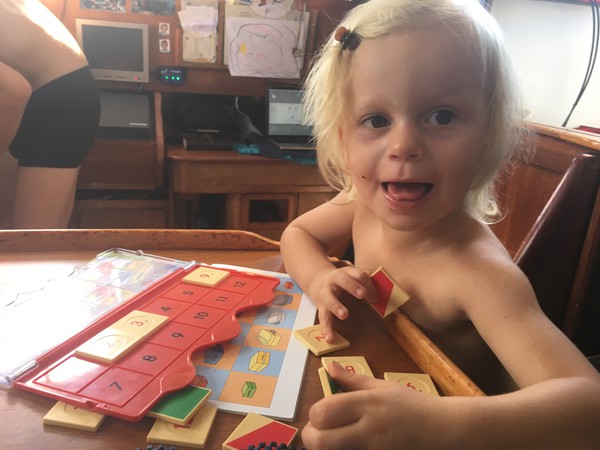 Building with magnets or Lego works even in when it´s rocky. Small Lego can then be found everywhere in the boat, thus we love Lego Duplo. We have not seen Lego Duplo outside Europe, normal Legos are rare and very expensive. It´s best if you can bring lego from home. Legos are one of our most important entertainment modules on board, we should have brought more. Wooden bricks are not that practical on board. Construction kits with screws are great too, the guys are very creative with them and are constructing new items almost every day.